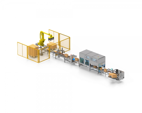利用机械手装箱、码垛机器人码垛,替代替代人工高强度的体力和重复性工作,高精度作业,占地面积小操作范围大,安全性能好;