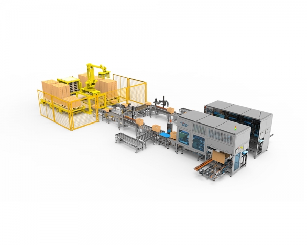 装箱码垛生产线由码垛模块,选别模块,开箱模块,封箱模块,装箱工作站,开装箱一体机组成。